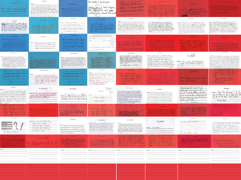 For a period of 3 weeks the presentation by Cynthia Weber will also be on view in the lobby of Stroom. On monitors the documentaries I Am An American and We are the 99% are screened and people can leave their comments on two 'Comment flags' on the wall: I Am An American and Ik ben een Nederlander (I am Dutch).