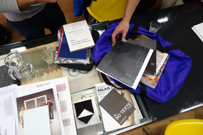 Voor deze bibliotheeksessie nam Marius Lut een tas met publicaties mee die hem hebben geïnspireerd. Vaak blijft het nieuw gekochte boek van een favoriete kunstenaar wekenlang in plastic geseald in het atelier liggen als object dat ongeopend al genoeg uitstraling heeft. Als het na een tijd geopend en ingekeken wordt, dan kan dat de aanleiding zijn om een ontwikkeling binnen zijn eigen schilderkunst radicaal te stoppen en verder te zoeken naar nog onontgonnen terreinen. Zo ontwikkelt zijn kunst zich in dialoog met, maar ook losgezongen van, het werk van bevriende en bewonderde kunstenaars. Marius liet verschillende ontwerpen voor zijn nieuwe boek zien. Voor de structuur van de publicatie heeft hij zich laten inspireren door de functies van een imaginair gebouw. Aanloopruimte, rustpunten, tijdsverloop, volume, schaal, verhouding en andere architectonische begrippen dienden als uitgangspunt voor de indeling en opbouw van het boek.