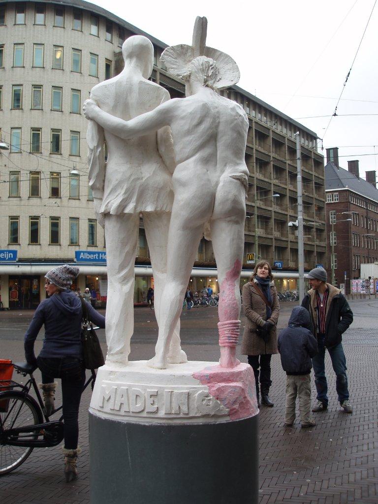 homestroom den haagprogrammakunst en de stedelijke omgevingsubsidies, documentatie en atelierskenniscentrumPublicatieseducatiepers archiefzoekenglish Anno Dijkstra, ‘A Last Farewell’, 2011 Centrum Den Haag: Spui - Grote Marktstraat - Kalvermarkt Een vakantiekiekje. Daar lijkt het sokkelbeeld van Anno Dijkstra (1970) nog het meeste op. Een inheemse bewoner van het Amazone-gebied in vol ornaat omarmt voor de foto een willekeurige westerse toerist. Het blijkt wel een kiekje met een scherp randje. Want waarom heeft de man geen rechterarm? En hoe komt het dat het witte beeld hier en daar gerepareerd lijkt te zijn in een andere kleur? Het praktische antwoord is dat die arm niet paste binnen de strakke afmetingen die voor elk sokkelbeeld gelden. Belangrijker zijn echter andere associaties die door de amputatie ontstaan. Samen met de reparaties roept het direct herinneringen op aan beelden van de oude Grieken en Romeinen. Tegelijkertijd verwijst het naar het feit dat de oorspronkelijke Amazone-cultuur voor haar voortbestaan tegenwoordig grotendeels afhankelijk is van toerisme. Omgekeerd heeft de westerse toerist behoefte aan het consumeren van authentieke culturen. Zeker in de drukke winkelstraten waar het sokkelbeeld staat, roept dat de vraag op: wie is er nu eigenlijk afhankelijk van wie? Veel van Dijkstra's werk gaat over beelden die krant en televisie dagelijks over ons uitstorten. Denk aan het napalmmeisje uit Vietnam, de paddenstoelwolk van de atoombom of de vermoorde Theo van Gogh. Deze vaak schokkende beelden staan in ons collectieve geheugen gegrift. Door van zulke iconische beelden hyperrealistische sculpturen te maken en ze op een bijzondere manier te presenteren, zet Dijkstra je aan het denken over wat die beelden eigenlijk laten zien en vooral ook hoe. Zo confronteert de kunstenaar de beschouwer niet alleen met zijn eigen reactie, maar ook met vragen over het gebruik van beelden in de media. In 2008 bijvoorbeeld plaatste Dijkstra tijdens de tentoonstelling Madrid Abierto een sculptuur van een ondervoed kindje op een boulevard in de Spaanse hoofdstad. Voorbijgangers sloegen het beeld een lap stof om, aaiden het of gingen ermee op de foto. Die uiteenlopende reacties zijn in een publicatie vastgelegd. www.annodijkstra.nl Meer over de Beeldengalerij: klik hier. PERS Den Haag Centraal, 23 december 2011 21 Dec '11 Anno Dijkstra, ‘A Last Farewell', 2011 foto: Sander Foederer, courtesy Stroom Den Haag Anno Dijkstra, ‘A Last Farewell', 2011 foto: Stroom Den Haag Anno Dijkstra, ‘A Last Farewell', 2011 foto: Stroom Den Haag Anno Dijkstra, ‘A Last Farewell', 2011 foto: Stroom Den Haag Anno Dijkstra, ‘A Last Farewell', 2011 foto: Stroom Den Haag