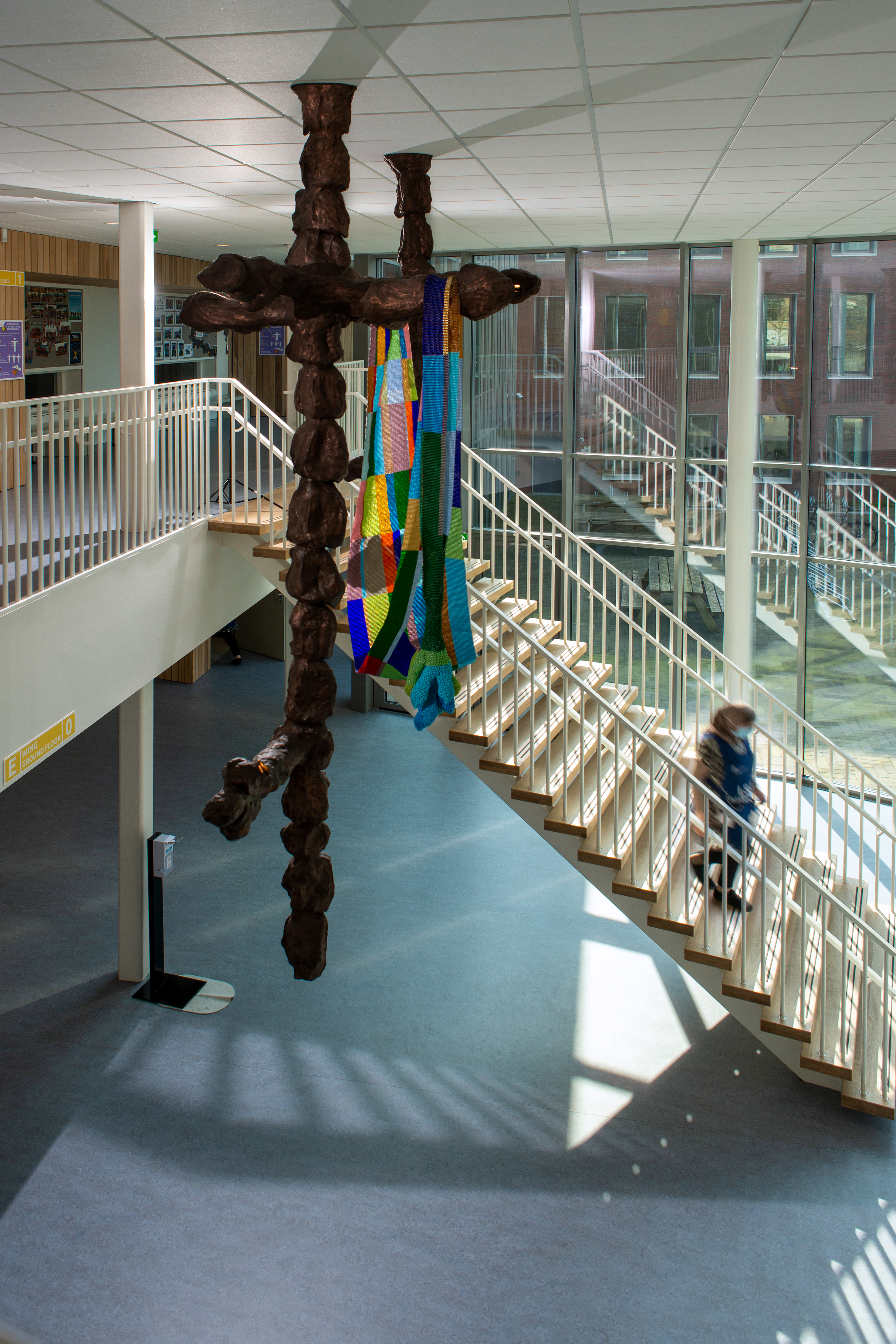De keuze viel op Esther Jiskoot, die met haar sculpturale objecten van glas en epoxy niet bang is om aparte items te integreren in haar objecten. Ze ontwierp voor de centrale aankomsthal een bot-achtig frame dat als het ware door de lucht zweeft. Het werkt als een soort van wegwijzer en vormt de kapstok voor een immense deken gemaakt van duizenden gekleurde glazen kralen. De structuur van het werk is zowel strak als organisch en de kunstenaar wil daarmee zowel het rationele als het creatieve denkvermogen van de kinderen aanspreken. De quizvraag hoeveel kralen het werk precies bevat is nog steeds niet geraden.