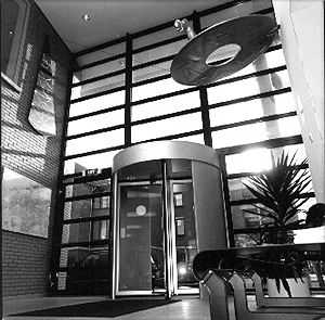 Een ronde aluminiumkleurige schijf met in het midden een gat, hangt in de entreehal van politiebureau Hoefkade. Op de schijf bevindt zich een mannetje met bolhoed dat balancerend op de rand naar beneden kijkt. Aan de onderkant van de schijf zijn in reliƫf fantasiefiguurtjes aangebracht die met stokken tegen klokken slaan. Het object is met een kabel verbonden aan de muur waar een tweedimensionaal zwart cirkelsegment hangt, voorzien van witte stippellijnen en cirkelvormen, die beweging suggereren.