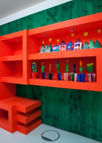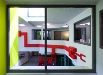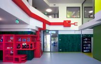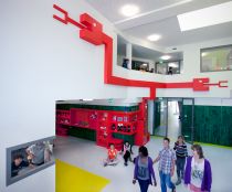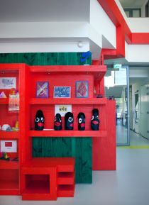 De keuze voor Rene Knip sloot perfect aan bij de architectuur van N2 architecten en de aanwezige beeldtaal. Voor de twee scholen ontwierp hij een grote rode draak, waarvan het langwerpige lichaam zich over de gang uitsterkt als een vitrinekast. In de kasten worden tentoonstellingen van de leerlingen gepresenteerd, terwijl de poten als zitjes dienen. In de centrale hal splitst de kop zich in tweeën en wijst hij de weg.