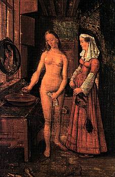 Vrouw aan haar toilet, copie van Willem van Haecht in Kunstkamer van Cornelis van der Geest (1628), perspectivisch gecorrigeerd door Gerlach en Koop foto: (Origineel (ca. 1433) van Jan van Eyck is verdwenen)