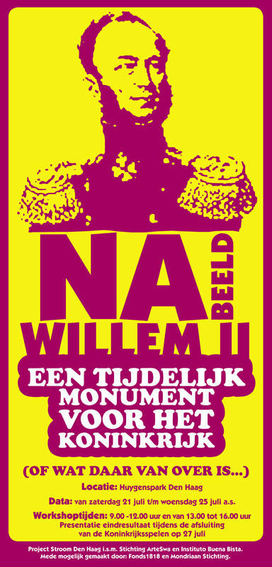 Beeldend kunstenaars David Bade en Tirzo Martha nemen vier van hun leerlingen van het Instituto Buena Bista op Curaçao (M.J. Franco Zapata, Kendrick Boelijn, Harvey Davelaar en Aldino ‘Junny' Kuwas) mee naar Den Haag om een explosieve workshop te verzorgen voor het Haagse publiek. Het doel van deze workshop is onder andere om op bredere wijze aandacht te vragen voor het koninkrijk en de verbintenissen binnen onze samenleving door te bouwen aan een nieuw en tijdelijk monument voor het koninkrijk. Daarbij worden de kernwaarden van de monarchie onder de loep genomen, nagedacht over de migrerende burger in het koninkrijk en hoe je de condities voor verbondenheid in beelden kunt vertalen. Een nieuw ruiterstandbeeld als nabeeld van Willem II.