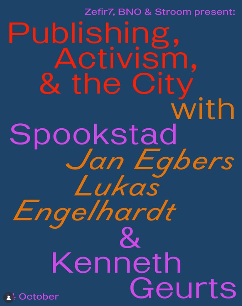 Deze editie draait om thema’s als publiceren, design als activisme en de relatie tot de stad. Spookstad is een in Amsterdam gevestigd publicatie-initiatief dat is voortgekomen uit het kraakcollectief Mokum Kraakt. Hun doel is om de boodschap, idealen en praktische kennis van directe emancipatoire actie onder een breder publiek te verspreiden. De presentatie van de avond wordt verzorgd door twee leden van het collectief, Jan Egbers en Lukas Engelhardt. Zij vertellen over het opzetten van hun publicatiepraktijk en over hoe je kunt ontwerpen in solidariteit met activistische bewegingen.