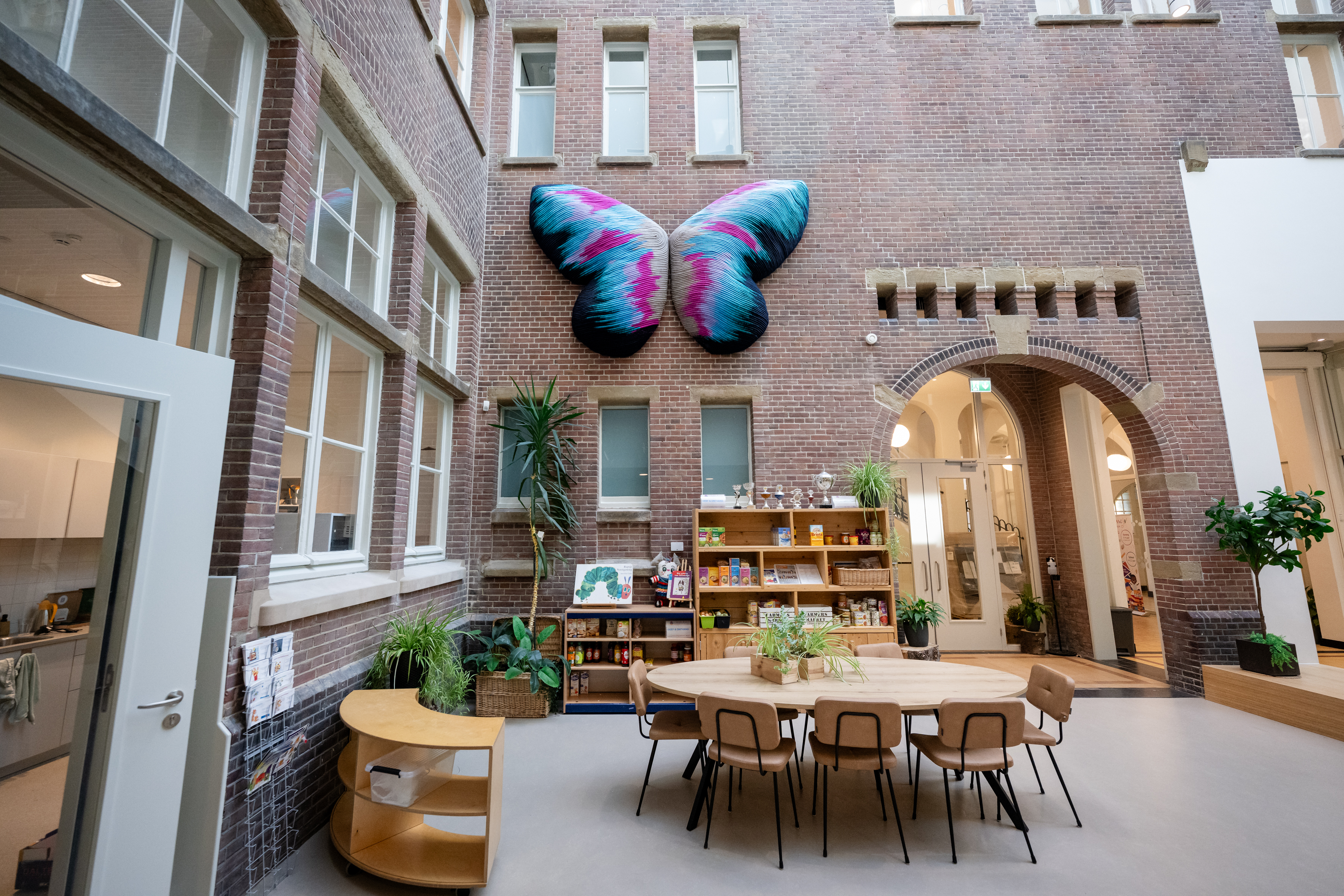 Joana Schneider is a textile artist. During her Textiles study at the Royal Academy of Art in The Hague she developed her passion for textile techniques - especially knotting techniques from fishing. As a student she had a temporary studio in the building of the Toermalijn Community School. With the present commission she has returned to this location. The more than life-size rope works that Joana was working on at the time had captured the attention of the school’s art committee, and they invited the artist to make a monumental textile work for the school. Her playful use of unusual materials - discarded ropes and viscose threads made from recycled plastic bottles - is beautifully expressed in the Toermalijn in the form of a colorful butterfly in the entrance hall. It is a butterfly that spreads its wings over the children’s heads as a protector and a symbol of their transition and development.