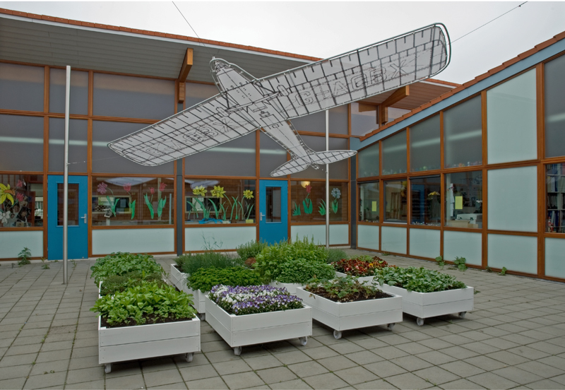 Voor de binnenplaats van de school ontwierp beeldend kunstenaar Annechien Meier twaalf mobiele volkstuintjes waarboven een vliegtuig zweeft. De schaduw van dit vliegtuig - de 'Tigermoth'- beweegt mee met de zon over het strak gekaderde Hollandse landschap in de bakken daaronder.