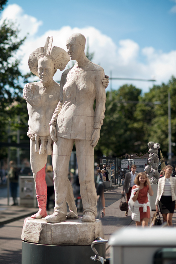 homestroom den haagprogrammakunst en de stedelijke omgevingsubsidies, documentatie en atelierskenniscentrumPublicatieseducatiepers archiefzoekenglish Anno Dijkstra, ‘A Last Farewell’, 2011 Centrum Den Haag: Spui - Grote Marktstraat - Kalvermarkt Een vakantiekiekje. Daar lijkt het sokkelbeeld van Anno Dijkstra (1970) nog het meeste op. Een inheemse bewoner van het Amazone-gebied in vol ornaat omarmt voor de foto een willekeurige westerse toerist. Het blijkt wel een kiekje met een scherp randje. Want waarom heeft de man geen rechterarm? En hoe komt het dat het witte beeld hier en daar gerepareerd lijkt te zijn in een andere kleur? Het praktische antwoord is dat die arm niet paste binnen de strakke afmetingen die voor elk sokkelbeeld gelden. Belangrijker zijn echter andere associaties die door de amputatie ontstaan. Samen met de reparaties roept het direct herinneringen op aan beelden van de oude Grieken en Romeinen. Tegelijkertijd verwijst het naar het feit dat de oorspronkelijke Amazone-cultuur voor haar voortbestaan tegenwoordig grotendeels afhankelijk is van toerisme. Omgekeerd heeft de westerse toerist behoefte aan het consumeren van authentieke culturen. Zeker in de drukke winkelstraten waar het sokkelbeeld staat, roept dat de vraag op: wie is er nu eigenlijk afhankelijk van wie? Veel van Dijkstra's werk gaat over beelden die krant en televisie dagelijks over ons uitstorten. Denk aan het napalmmeisje uit Vietnam, de paddenstoelwolk van de atoombom of de vermoorde Theo van Gogh. Deze vaak schokkende beelden staan in ons collectieve geheugen gegrift. Door van zulke iconische beelden hyperrealistische sculpturen te maken en ze op een bijzondere manier te presenteren, zet Dijkstra je aan het denken over wat die beelden eigenlijk laten zien en vooral ook hoe. Zo confronteert de kunstenaar de beschouwer niet alleen met zijn eigen reactie, maar ook met vragen over het gebruik van beelden in de media. In 2008 bijvoorbeeld plaatste Dijkstra tijdens de tentoonstelling Madrid Abierto een sculptuur van een ondervoed kindje op een boulevard in de Spaanse hoofdstad. Voorbijgangers sloegen het beeld een lap stof om, aaiden het of gingen ermee op de foto. Die uiteenlopende reacties zijn in een publicatie vastgelegd. www.annodijkstra.nl Meer over de Beeldengalerij: klik hier. PERS Den Haag Centraal, 23 december 2011 21 Dec '11 Anno Dijkstra, ‘A Last Farewell', 2011 foto: Sander Foederer, courtesy Stroom Den Haag Anno Dijkstra, ‘A Last Farewell', 2011 foto: Stroom Den Haag Anno Dijkstra, ‘A Last Farewell', 2011 foto: Stroom Den Haag Anno Dijkstra, ‘A Last Farewell', 2011 foto: Stroom Den Haag Anno Dijkstra, ‘A Last Farewell', 2011 foto: Stroom Den Haag