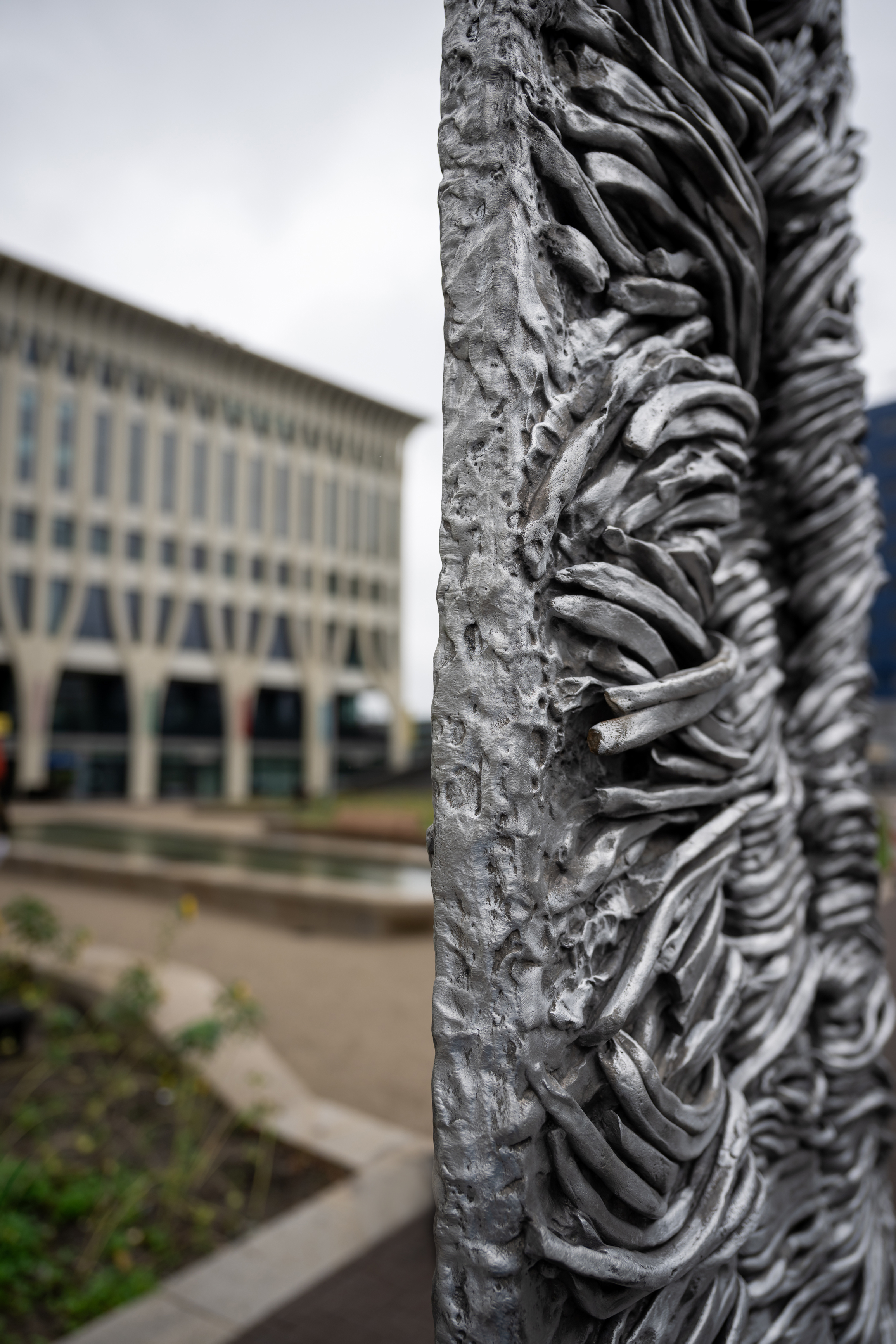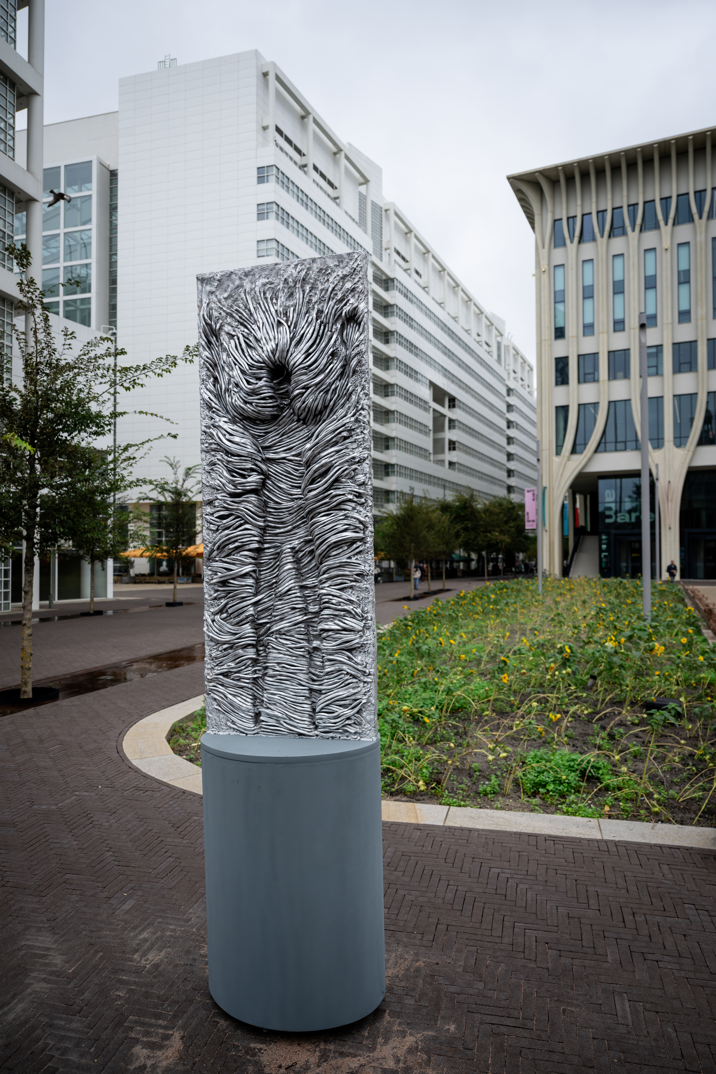 In het oeuvre van Eylem Aladogan zijn wilskracht en weerstand terugkerende thema’s. De titel van het beeld - A Coffined Cry Cries Out in the Crowd -, is geïnspireerd op protestsongs en het werk van de kunstenaar William Blake, waarin ze het gevoel van overgave en radicaliteit herkent. Het nieuwe werk geeft uitdrukking aan de vraag hoe pijn te vertalen naar een concreet en tastbaar beeld. De onthulling vindt plaats tijdens een publiek programma op het Spuiplein in Den Haag met een muzikale omlijsting o.l.v. Boudewijn Ruigrok.