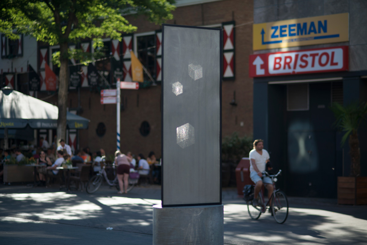 Het beeld Bambaataa van Gabriel Lester is een grote zwartmetalen sculptuur, een driehoekige vorm, met daarin drie kubusvormen van lichtgrijs gaasmetaal. Aan één kant toont het een maskerachtig gezicht, waarvan de ogen en de mond zonlicht doorlaten. Hierdoor ontstaan er aan de andere kant holografische projecties van geometrische vormen. Hoewel het een sculptuur is, heeft het, in lijn met het oeuvre van Lester, een fotografisch en filmisch karakter: de verschijningsvorm zal steeds anders zijn al naar gelang de lichtsituatie en het standpunt van de kijker. Het beeld komt aan de Grote Marktstraat te staan, precies op het zuidoosten - als de zon zakt dan staat ze, als een spotlight, pal op het beeld.