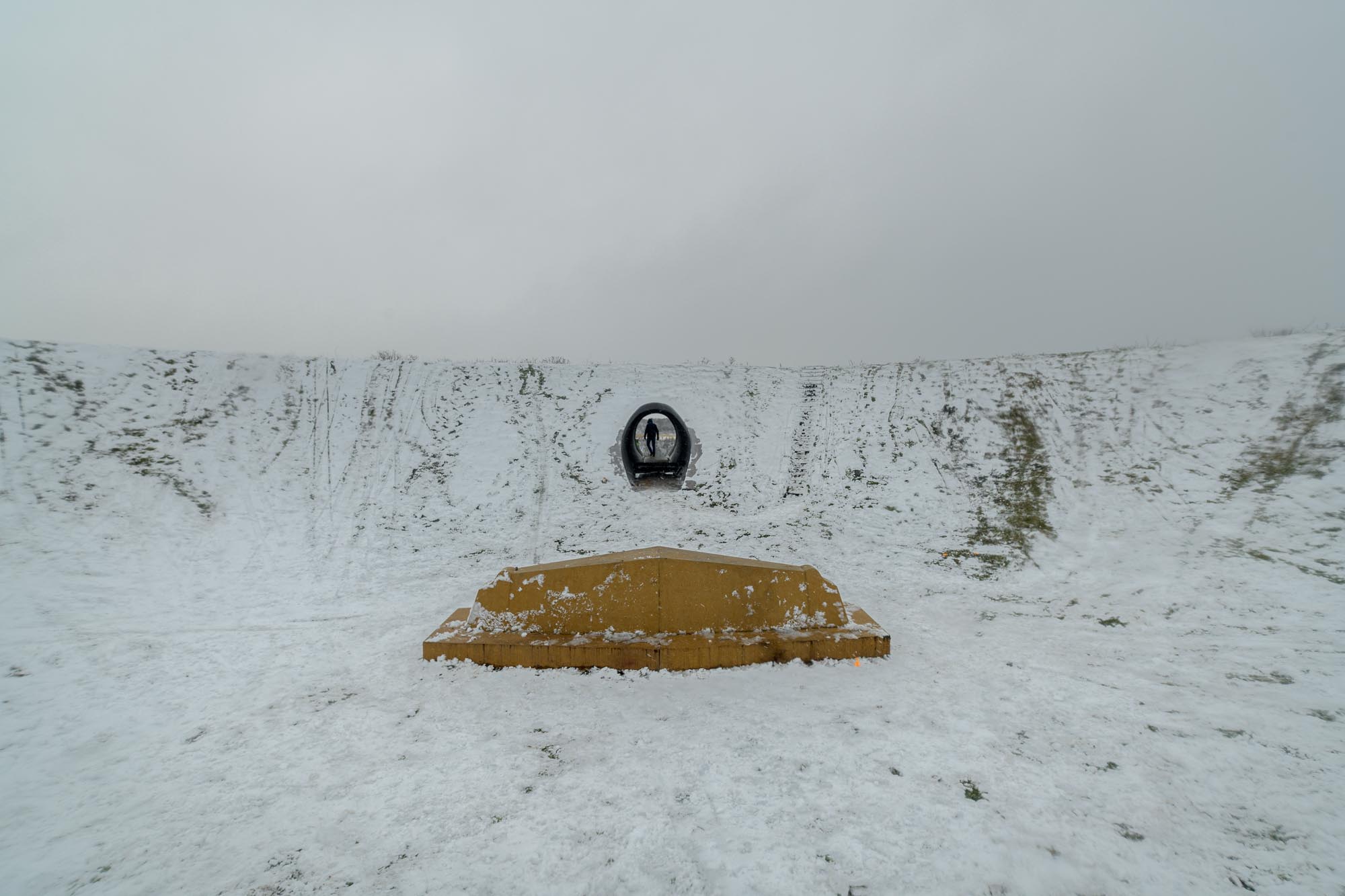 Op de top van een van de puinduinen is een kom aangelegd in de vorm van een ellips, 30 meter breed, 40 meter lang. Een aarden wal van ongeveer 5 meter hoog omsluit de kom. Om in deze kunstmatige krater te komen loop je eerst over houten treden het duin op en vervolgens door een betonnen doorgang van 6 meter lang. De glooiïngen aan de binnenkant van de krater zijn ingezaaid met gras en in het midden staat een monumentale bank van natuursteen waarop twee personen achterover kunnen liggen en kunnen zien hoe de hemel de vorm van een gewelf kan aannemen. Op een hoger gelegen duin staat eenzelfde bank waar zich een panorama ontvouwt over de zee, het strand en het platte land daarachter. In de richting van de horizon wordt het gewelf geleidelijk platter.