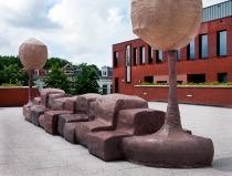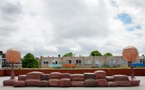 Nacho Carbonell heeft voor het Johan de Witt College in de Capadosestraat een reusachtig ‘bench' gemaakt. Op het dak van de school liggen de vleeskleurige kussen als in een huiskamer te wachten op de leerlingen. Als het donker wordt, werpen twee reusachtige maanvormige bollen licht over het plein en kijk je prachtig uit over de Haagse skyline.