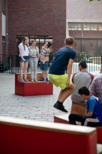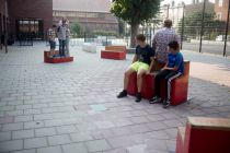Zweven, dobberen, porren, drukken... het zijn allemaal woorden die iets zeggen over de toestand van beweging. Rogier Martens ontwierp, in het kader van de kunst bij scholen regeling via Stroom Den Haag, ‘Floaters', vier banken voor praktijkschool De Poort. Martens ging voor zijn onderzoek een tijdje rondhangen op het schoolplein van De Poort en het viel hem op hoe de leerlingen op elkaar lijken qua kleding en gedrag. Rogier was gewend dat er op het schoolplein juist heel veel verschillende groepjes rondhingen waarbij iedereen zich probeerde te onderscheiden. Hij ontwierp voor De Poort vier banken, die via een hydraulisch systeem onder de grond met elkaar verbonden zijn. In de houten zitting van de banken zijn woorden gegoten die te maken hebben beweging. Als je op de ene bank gaat zitten, gaat er ergens anders één omhoog; actie/ reactie. Hierdoor wil Rogier laten zien dat alles wat je doet met elkaar verbonden is.