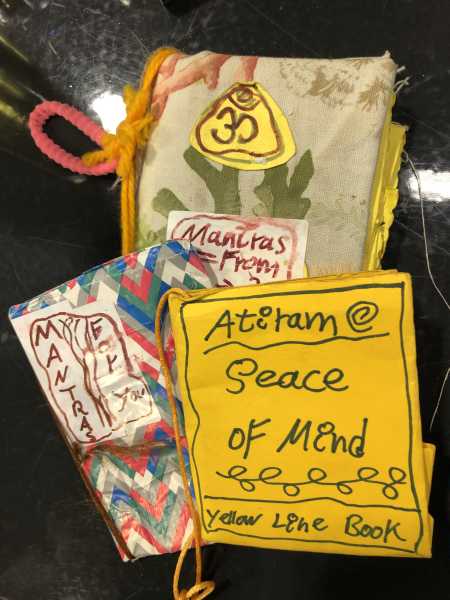 Shani Leseman Atitam, Peace of Mind (Yellow Line Book) ; Mantras from A – Z ; Mantras for You / anoniem. - s.l. [Ibiza?] : in eigen beheer, jt onbekend. - 3 gebonden boekjes, ongepagineerd : ill. ; ca 18 cm “De maker heb ik ontmoet op een vlooienmarkt op Ibiza. Zijn uitgangspunt was denk ik vooral het delen van zijn kennis, of aangezien hij zelf niet centraal stond, als een soort doorgeefluik van spirituele kennis. Er staan wat verwijzingen in naar het Vaishnavisme maar er staan ook meer persoonlijke teksten in.” (SL)