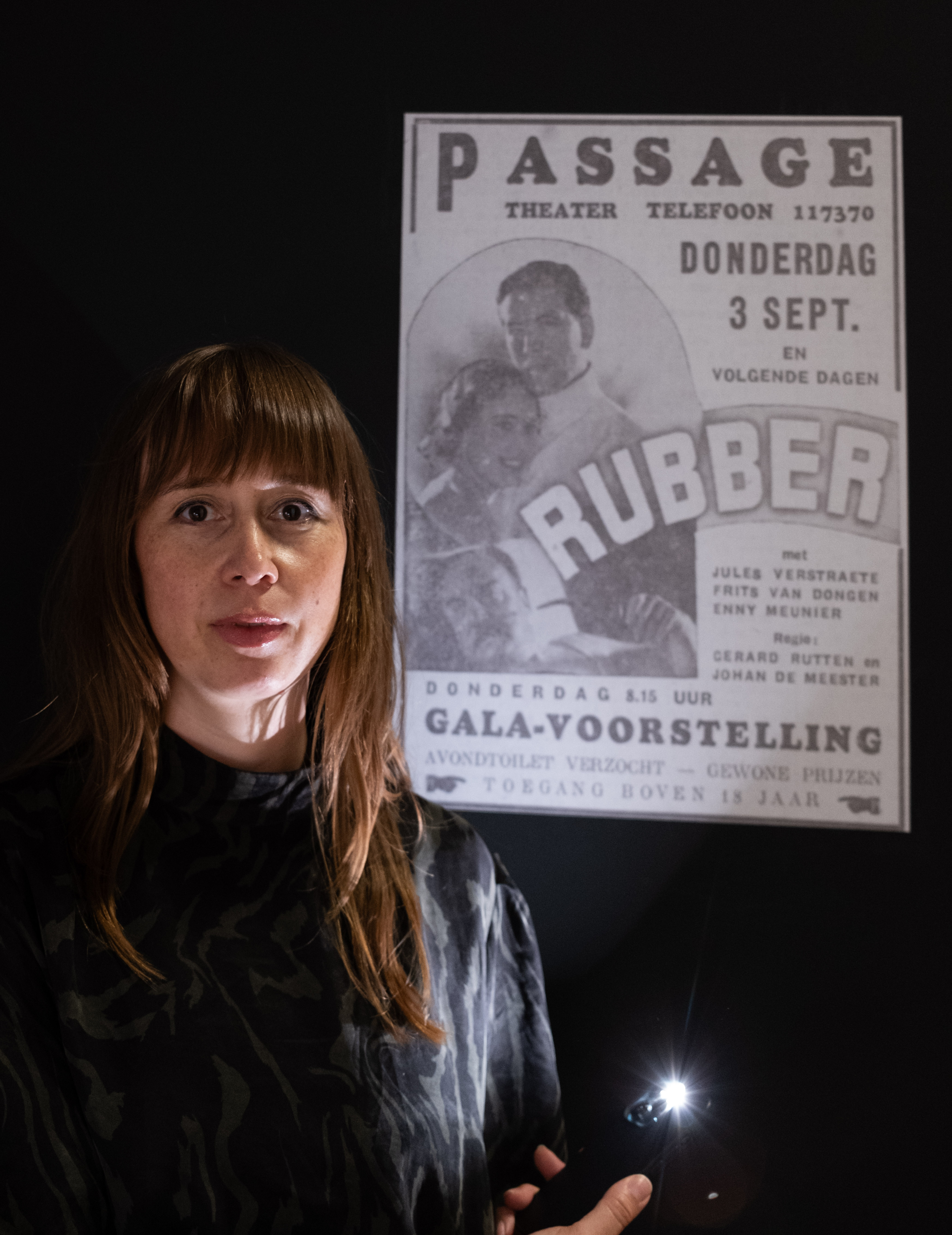 De film Rubber ging in 1936 in première in de Passage Theaterbioscoop in Den Haag. De plantersgemeenschap en het Koloniale Ministerie waren tevreden met de weergave van het koloniale project in de film. Na de première werd de film nog vele malen in Nederland vertoond. De pers prees Amsy Moina voor haar ontroerende weergave van Kiku San. Echter, op een gegeven moment werd het personage van Kiku San verwijderd uit het enige distributie-exemplaar van de film voor onduidelijke redenen. Geïnteresseerd in de carrière van Amsy Moina, ontdekte kunstenares Sabine Groenewegen haar verdwijning uit de film op. Ze begon haar onderzoek naar de verwijderde scènes. Tijdens haar onderzoek vond Groenewegen de vergeten dialooglijst, waarmee ze de ontbrekende scènes kon reconstrueren.