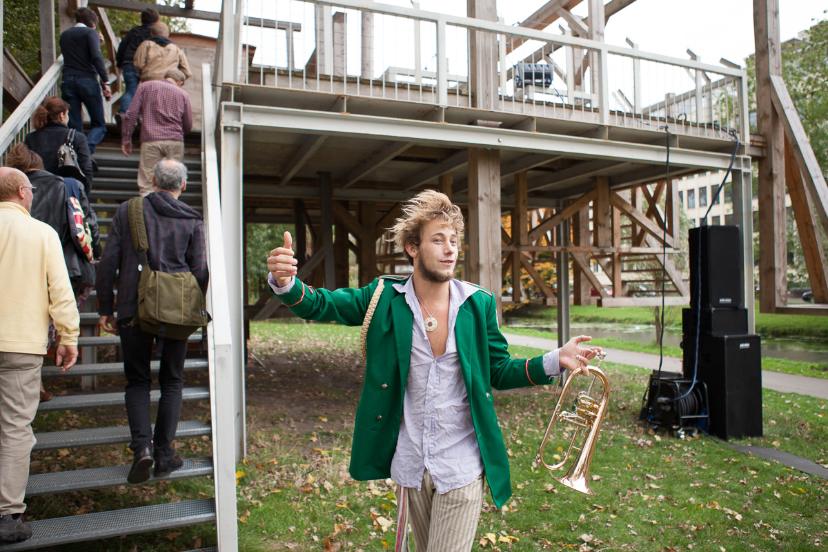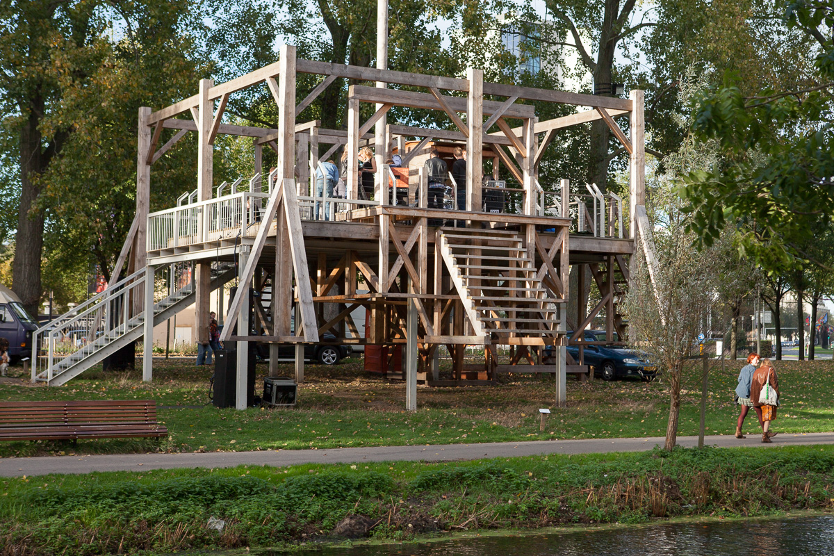 Haagse bands spelen op Scaffold van kunstenaar Sam Durant nummers over 'peace and justice' (i.s.m. Haags Pop Centrum).