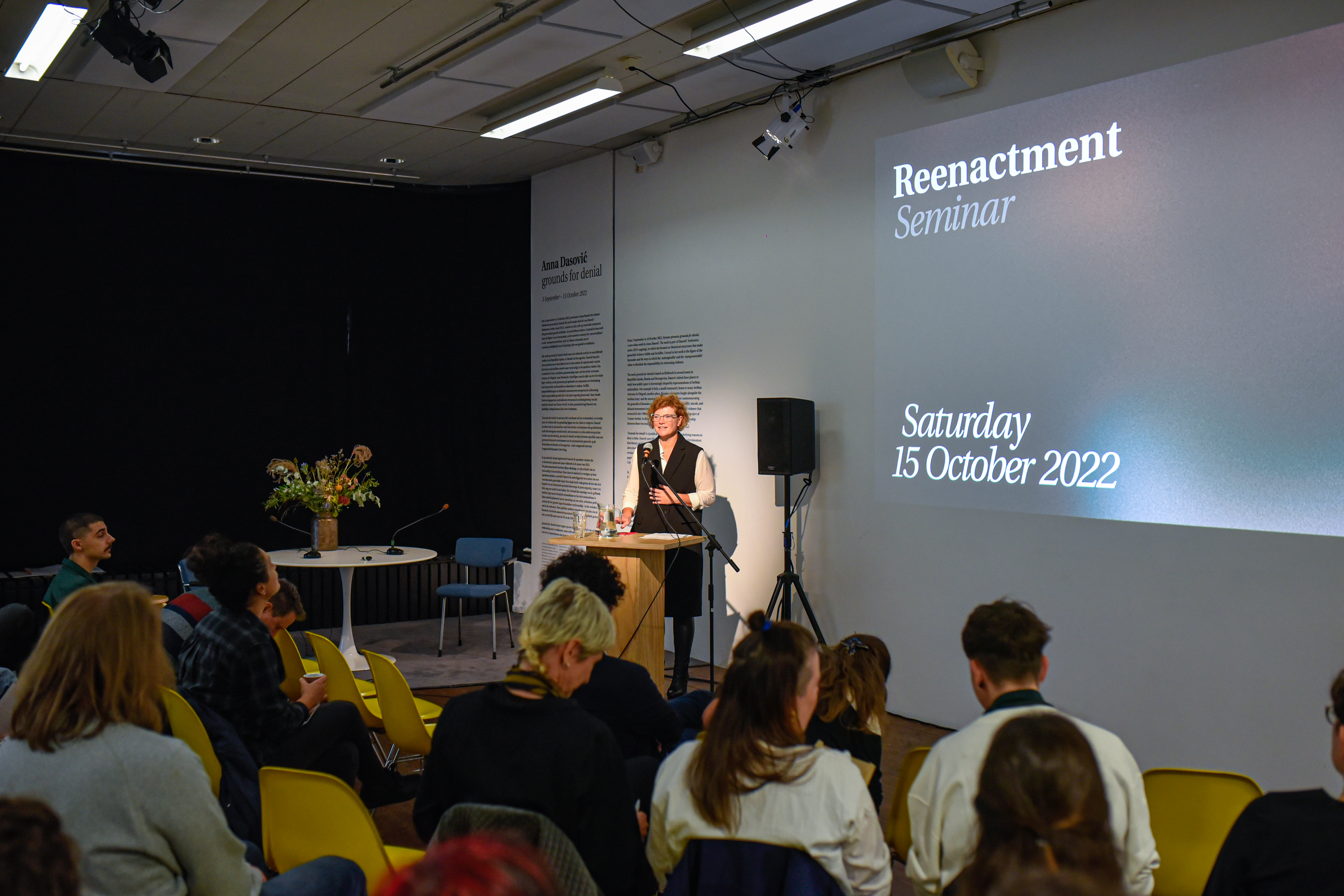 Uitgangspunt voor dit programma is de presentatie van het nieuwe videowerk grounds for denial van Anna Dasovic, momenteel te zien bij Stroom Den Haag. Het werk maakt deel uit van Dasovic' Srebrenica serie (2015 - heden), waarin zij zich richt op retorische structuren die genocidaal geweld zichtbaar en onzichtbaar maken. Het seminar Reenactment probeert deze gebeurtenissen te contextualiseren binnen hedendaagse ontwikkelingen en reflecties sindsdien: de erfenis van het Joegoslavië-tribunaal, de toekomst van de invloed van de NAVO in de regio en de relatie tussen de passiviteit van de internationale gemeenschap en de Russische oorlog tegen Oekraïne.